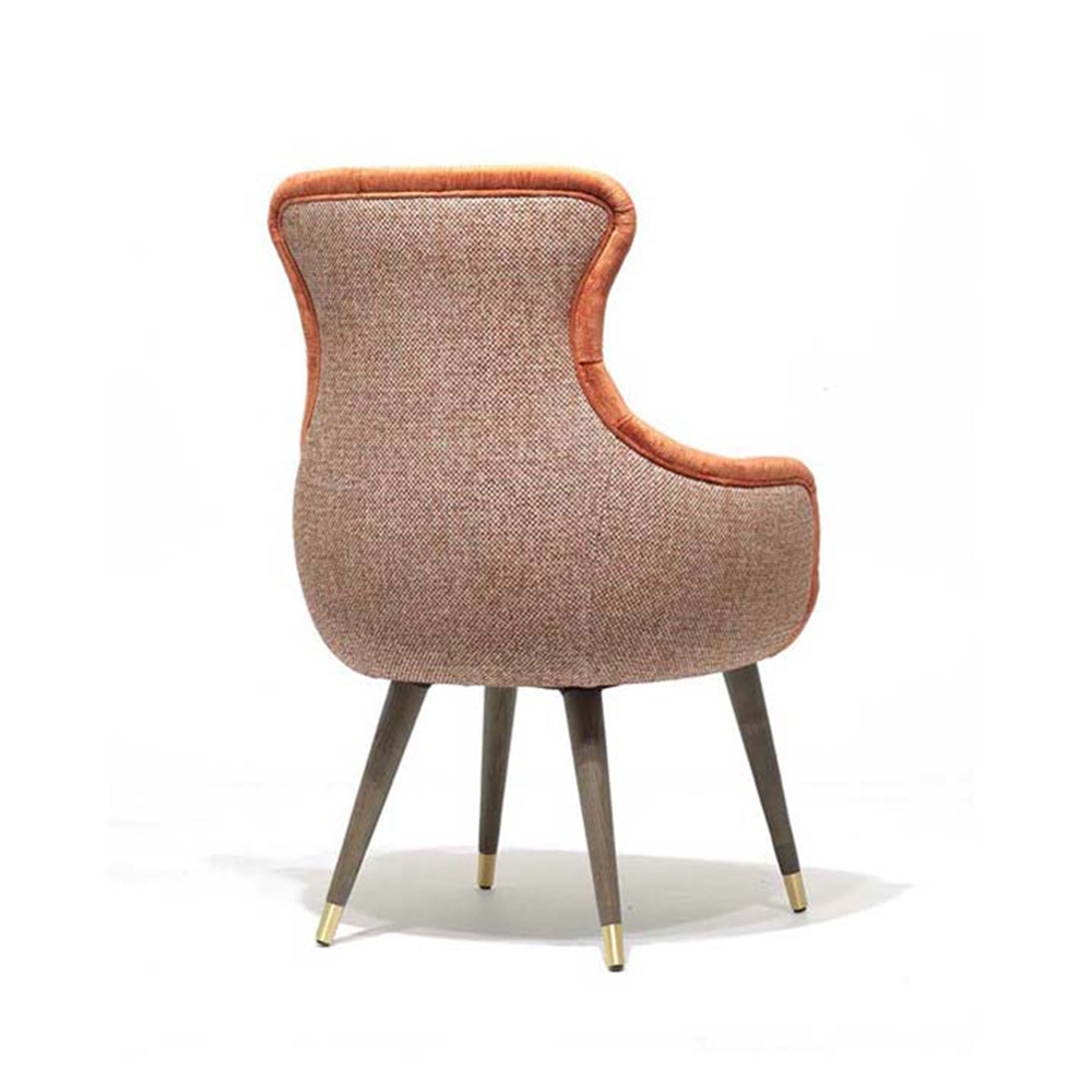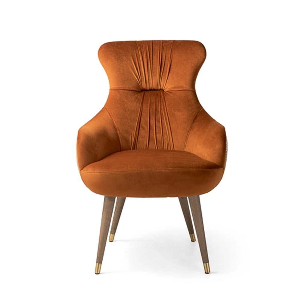 The classic Bacco Armchair modified to promote optimal relaxation. Abundant padding creates an enveloping, snug seat while the detail on the wraparound arm adds depth to the rounded shape. This high back lounge chair encourages rest and relaxation. The chair has everything needed for the contract and consumer segments and is perfect for a quick rest in a hotel lobby or a TV dinner in the lounge at home. In addition, we are able to upholster the lounge chair in a wide range of fabrics and leathers to suit. Available in a variety of wood stains, lacquers, and European Oak.