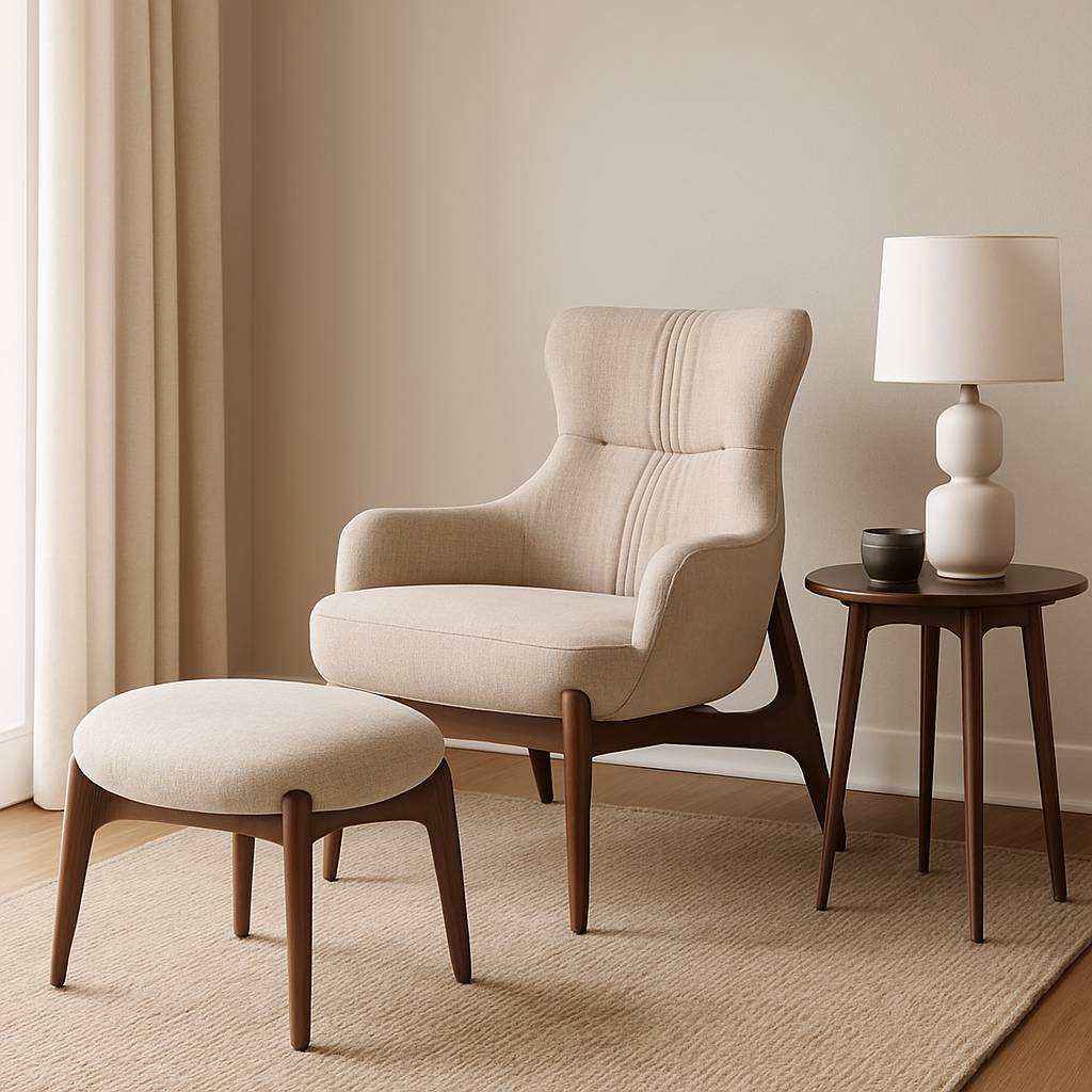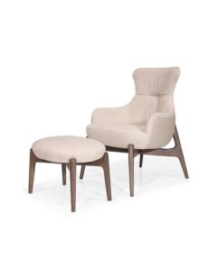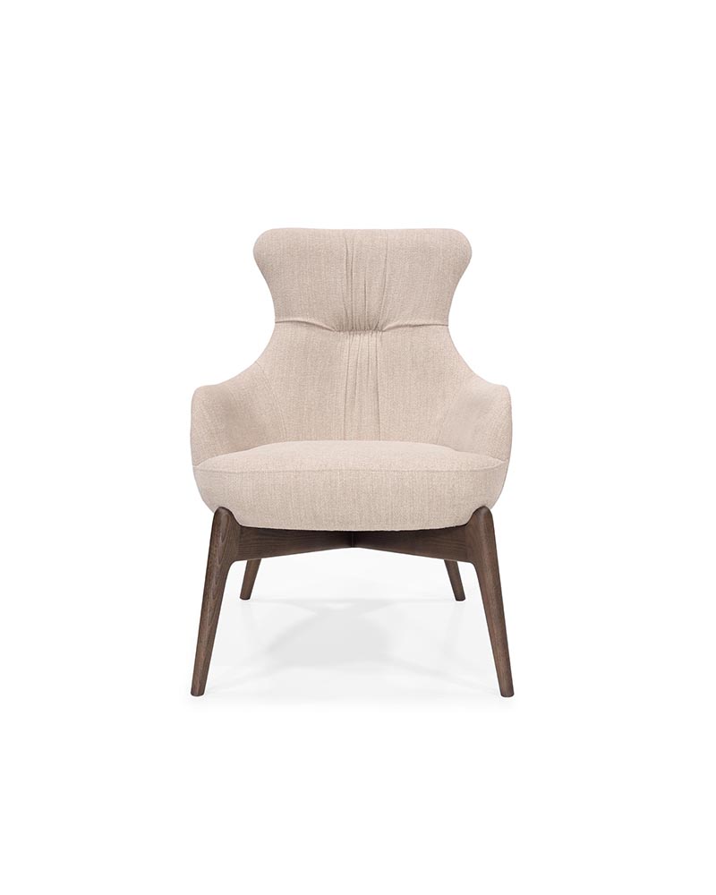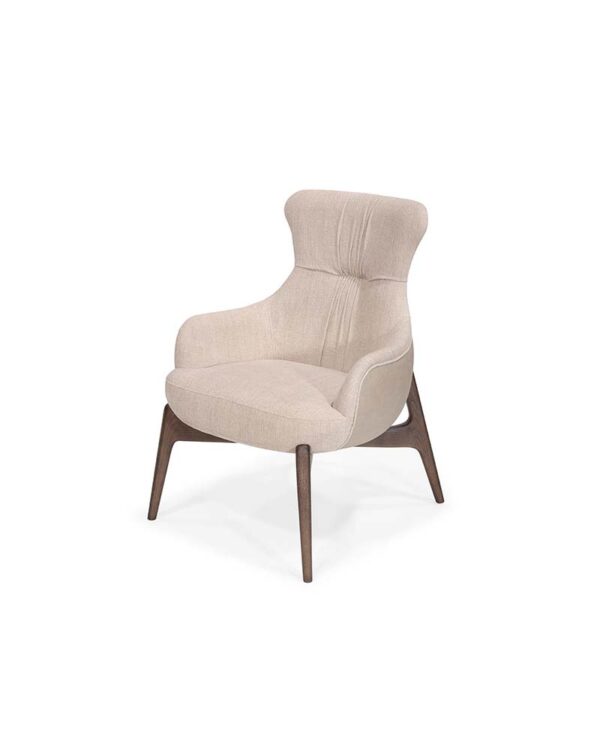 The Bacco Lounge Chair blends sculptural comfort with refined craftsmanship, featuring a softly contoured, fully upholstered seat and a high, supportive backrest with subtle channel detailing. Its enveloping form is complemented by a solid wood base with angled legs, adding warmth and architectural balance to the design.