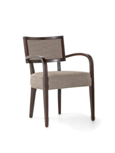 The Chicago Armchair is a classic, clean, sleek design featuring a bordered wooden back and upholstered seat. The cleanliness of the design will allow this chair to fit into almost any type of urban decor. Ideal for a bar, restaurant, or hotel lobby area. Upholstered in fabric, leather, or faux leather. Available in a variety of wood stains, lacquers, and European Oak.