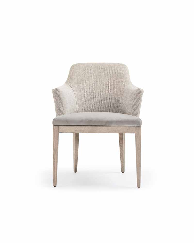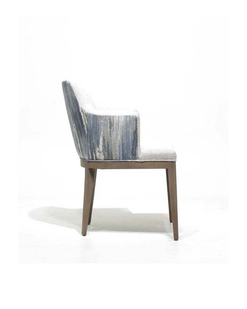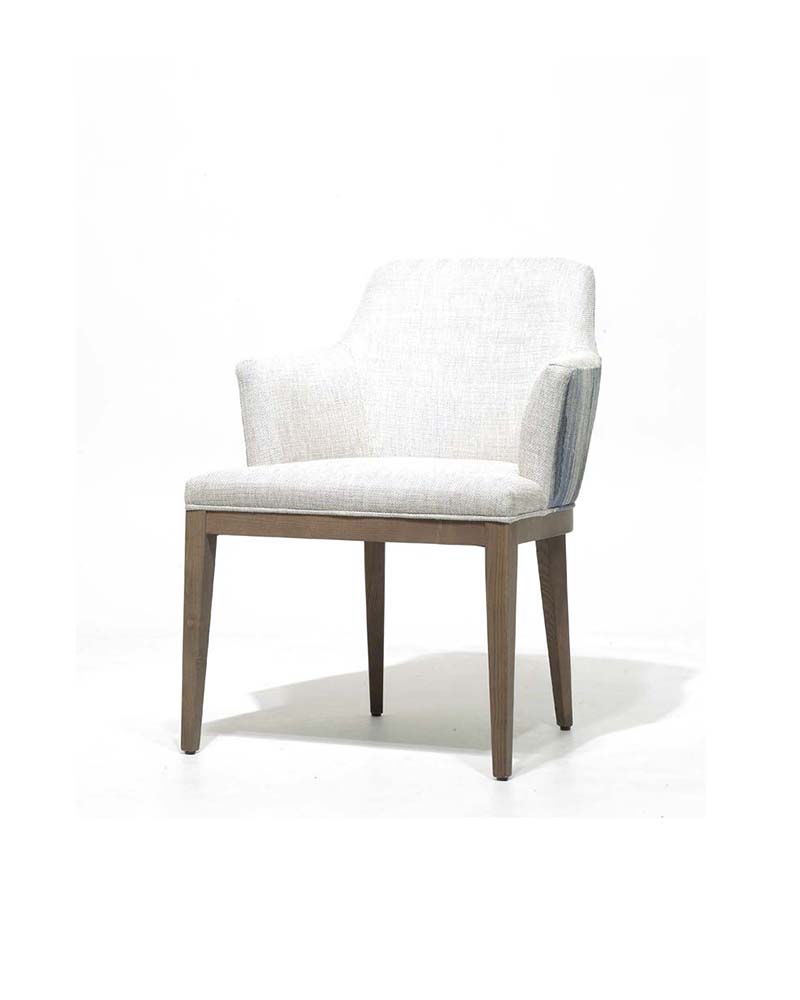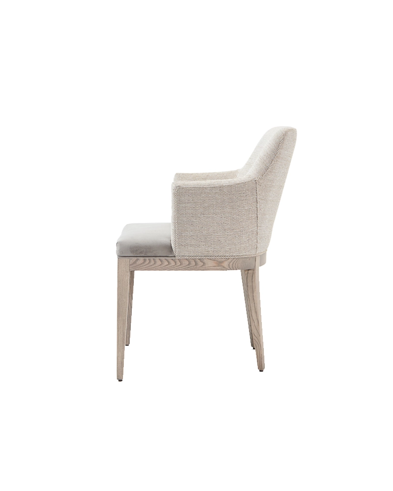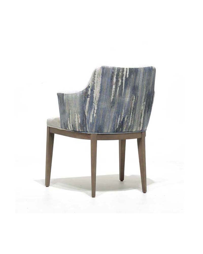 The Gobi Armchair is effortlessly transitional. Finished in a variety of stains or lacqurs, the solid wood legs support a shapely upholstered seat of high-performance fabric, leather or faux leather, for comfortable everyday dining.