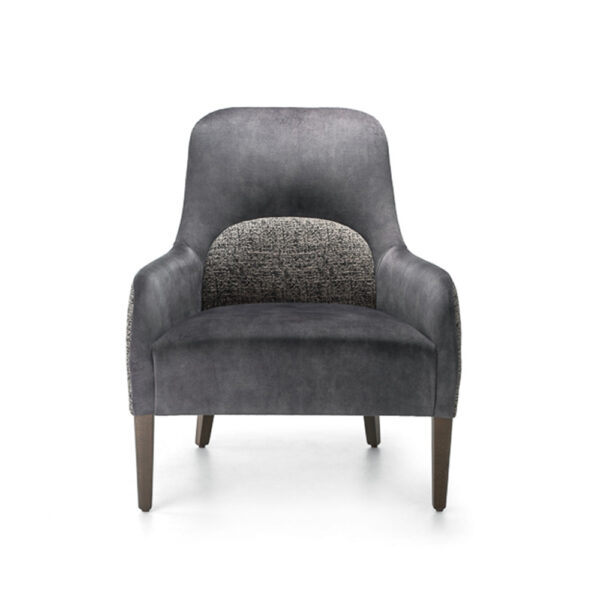 This upholstered loung chair is a classic and modern designed piece. The ergonomic and enveloping backrest supports your back and at the same time gives you maximum comfort. The legs are in solid wood, while the rest of the chair is covered in fabric. One of the characteristics of Moyos is the detail of the back inset upholstery that follows the profile. The inset portion can be made in the same fabric, or in a contrasting material. In addition, we are able to upholster the chair in a wide range of fabrics and leathers to suit. Available in a variety of wood stains, lacquers, and European Oak.