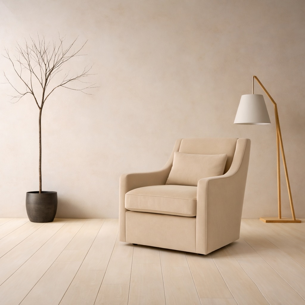 The Neve Chair is a sculpted swivel lounge piece designed for both form and function. Its continuous silhouette flows seamlessly from arm to back, offering enveloping comfort and a timeless sense of refinement ideal for hotel suites or modern living spaces.