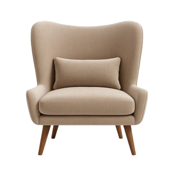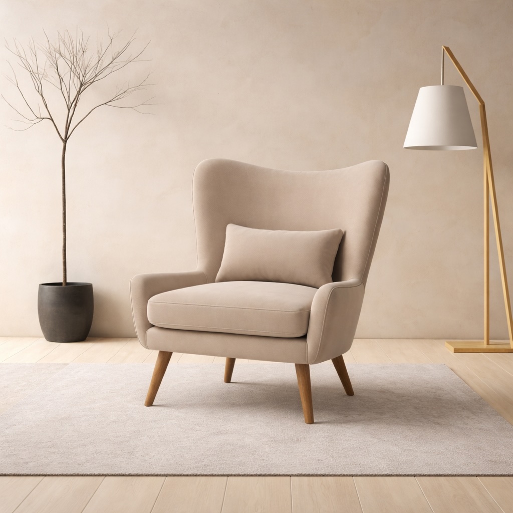 The Oriel Chair pairs sculptural form with mid-century poise. Its sweeping wingback silhouette embraces the sitter while tapered wooden legs lend a refined, modern foundation. Equally at home in a hotel lobby or a curated residence, Oriel blends comfort with timeless design.