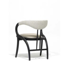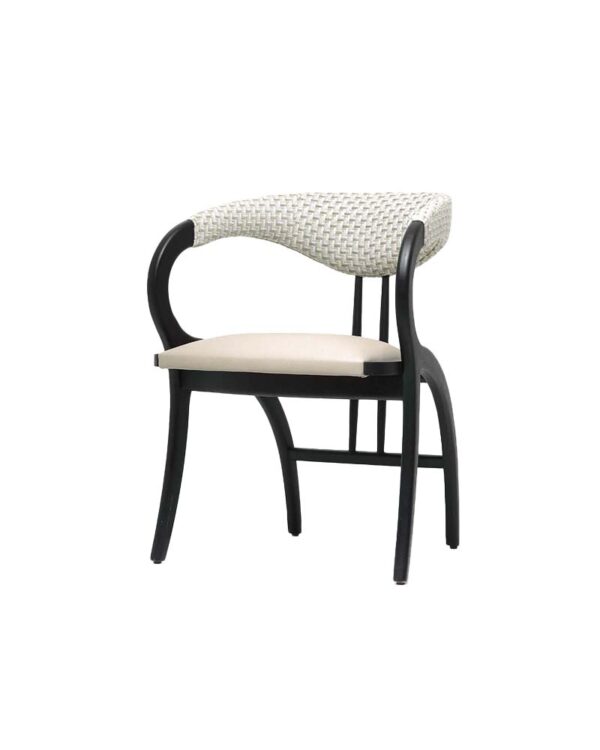 The Peru Dining Armchair blends sculptural elegance with modern craftsmanship. Featuring a gracefully curved frame in rich black wood, its woven backrest adds both texture and comfort. A plush upholstered seat enhances dining experiences with refined ease, making it ideal for hospitality and residential spaces alike. Designed for style and durability, the Peru is a statement of sophistication in any setting. Handcrafted of solid wood in a variety of finishes.