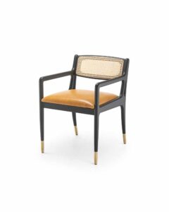 The Protis is a mid-century modern style dining chair in a luxurious finished frame. Backrest in natural woven cane or upholstery and polished brass caps on the hand spun legs. In addition, we are able to upholster the chair in a wide range of fabrics and leathers to suit.