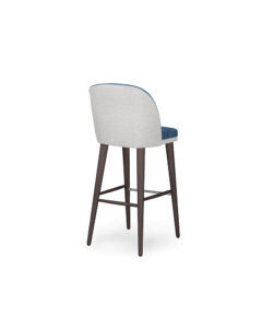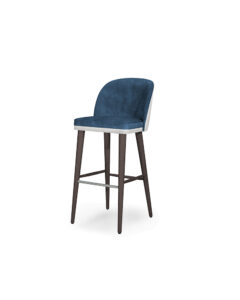Space is a Mid-Century Modern barstool upholstered in velvet. Crafted of solid wood frame stained in variety of colors Curved back for greater support and comfort to enjoy long dinners. Rounded brass metal caps. Also available in European oak.