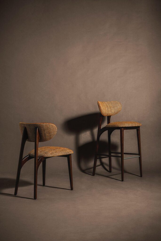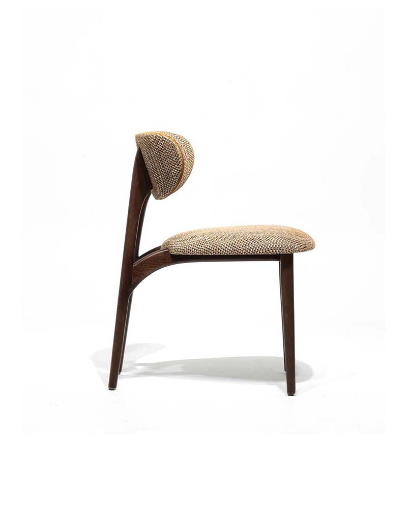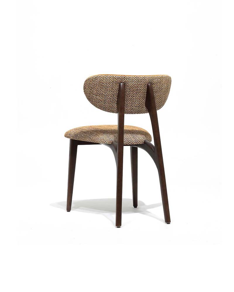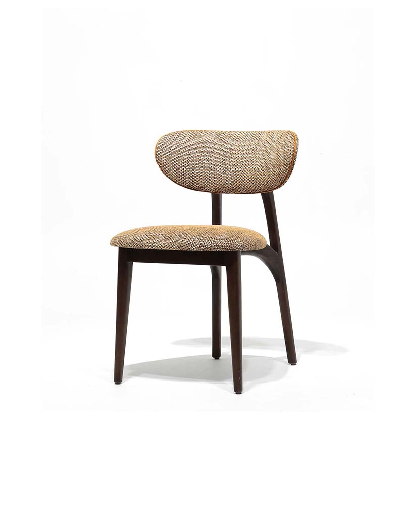 The Sue Chair combines mid-century charm with modern comfort. Featuring a gently curved backrest and seat upholstered in textured fabric, it sits atop a solid wood frame with sculpted lines for a refined finish. Its versatile design makes it ideal for dining rooms, lounges, or stylish hospitality spaces. Upholstered in fabric, leather or faux leather. Available in a variety of wood stains, lacquers, and European Oak.