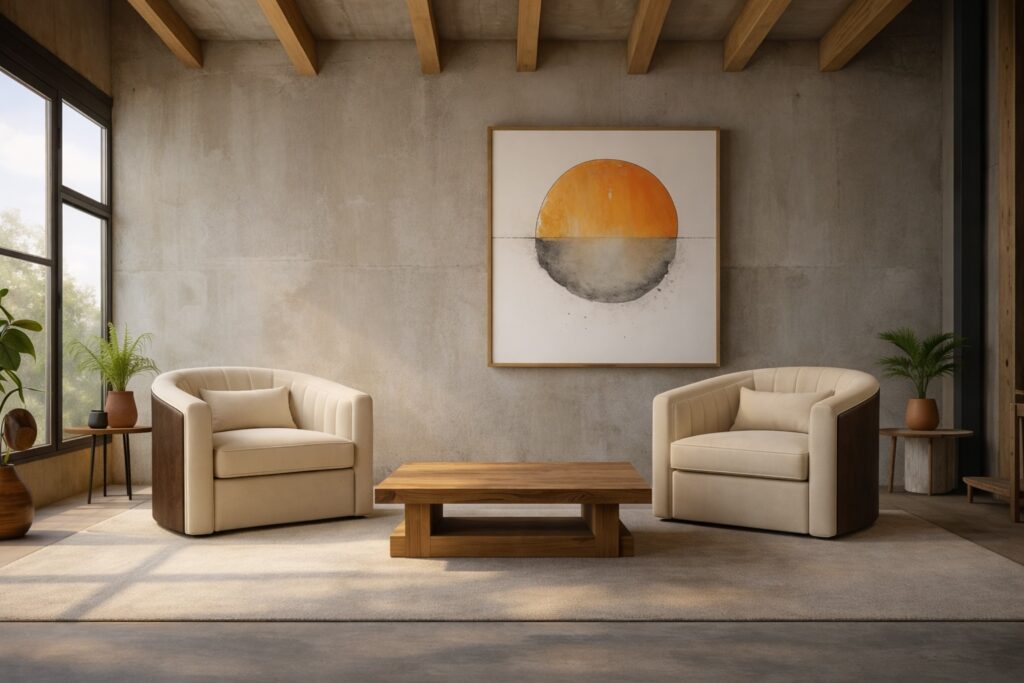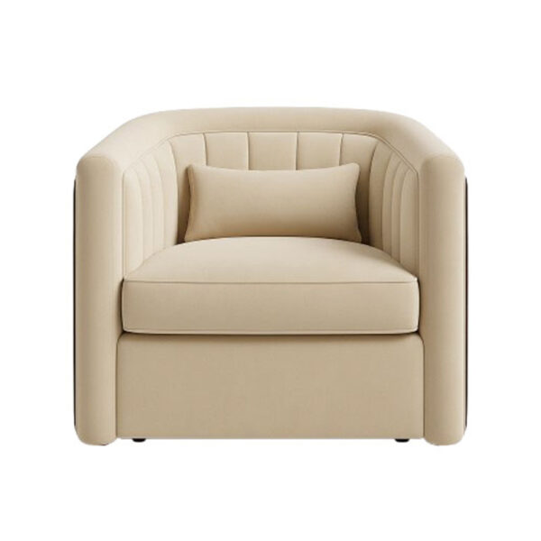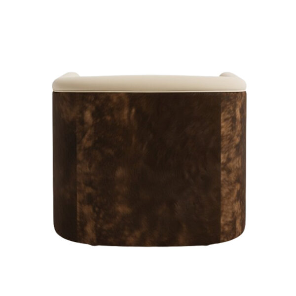 The Undine Chair pairs sculpted upholstery with striking material contrast. Channel stitching and soft interior curves are framed by a rich leather shell, blending refinement and bold presence. Perfect for hotel lobbies, lounges, or residential statement spaces, it offers comfort with architectural precision.
