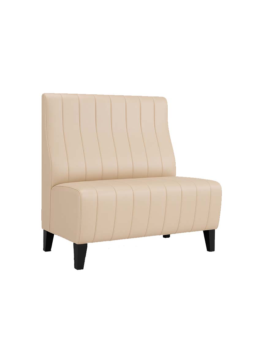 The Vertical-Tufted Banquette showcases sleek vertical channeling for a refined, modern-retro look. Upholstered for comfort and supported by tapered legs, this banquette is ideal for restaurants, lounges, and hotel dining areas, combining durability with elevated style for hospitality use. Upholstered in fabric, leather, or faux leather. Available in a variety of wood stains, lacquers, and European Oak. Custom sizes and bases available upon request.