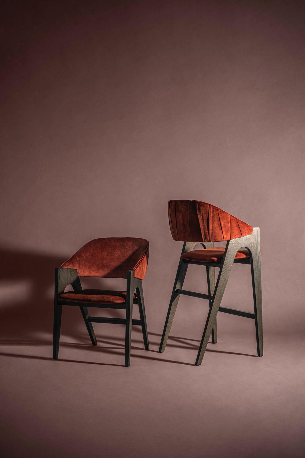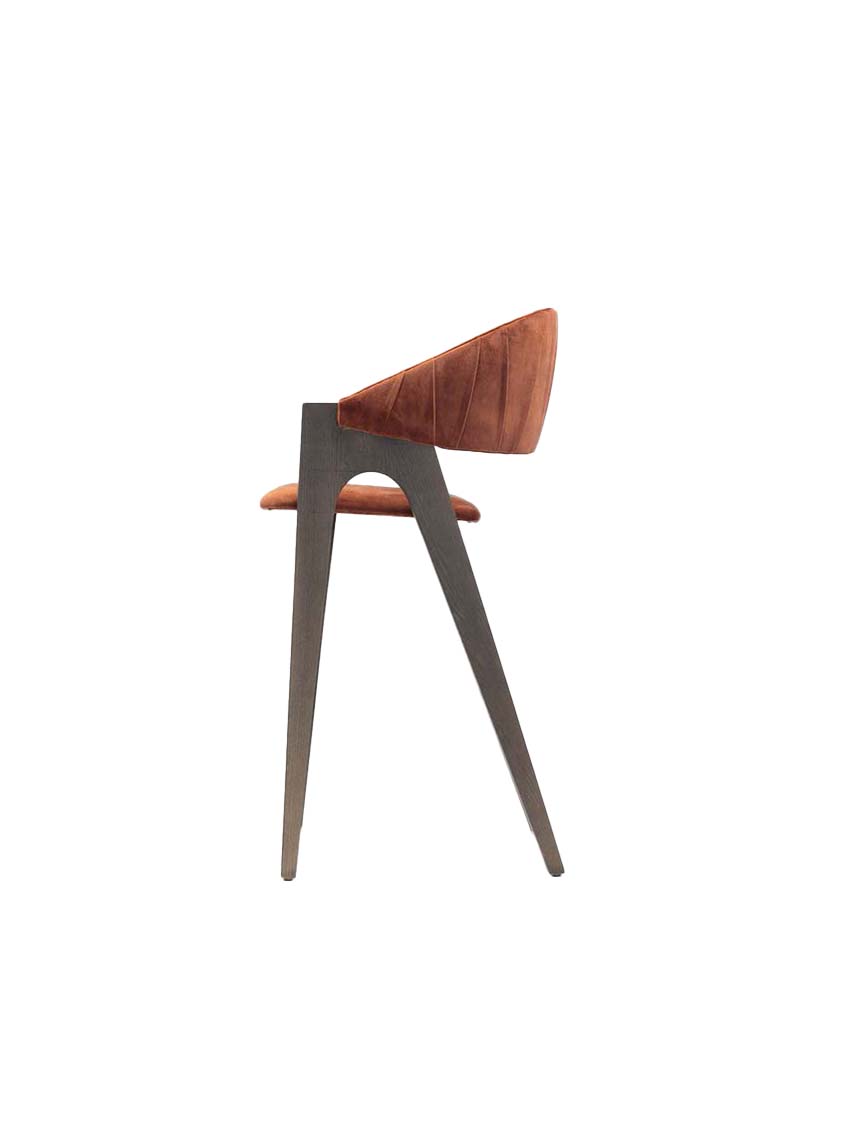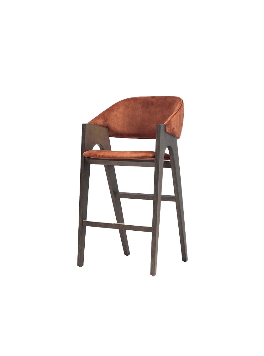 The Wallace Barstool combines bold design with refined comfort. Its angular wooden frame creates a striking silhouette, while the plush upholstered seat and curved backrest offer support and style. Finished with subtle vertical channel detailing, the Wallace Barstool makes a sophisticated statement in both hospitality and residential interiors. Upholstered in fabric, leather or faux leather. Available in a variety of wood stains, lacquers, and European Oak.